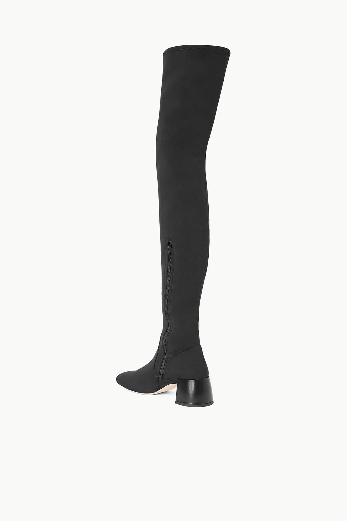 A tall over-the-knee boot made of stretchy neoprene with a short glossy leather block heel. This style features a calf-length side zipper for ease of use.
