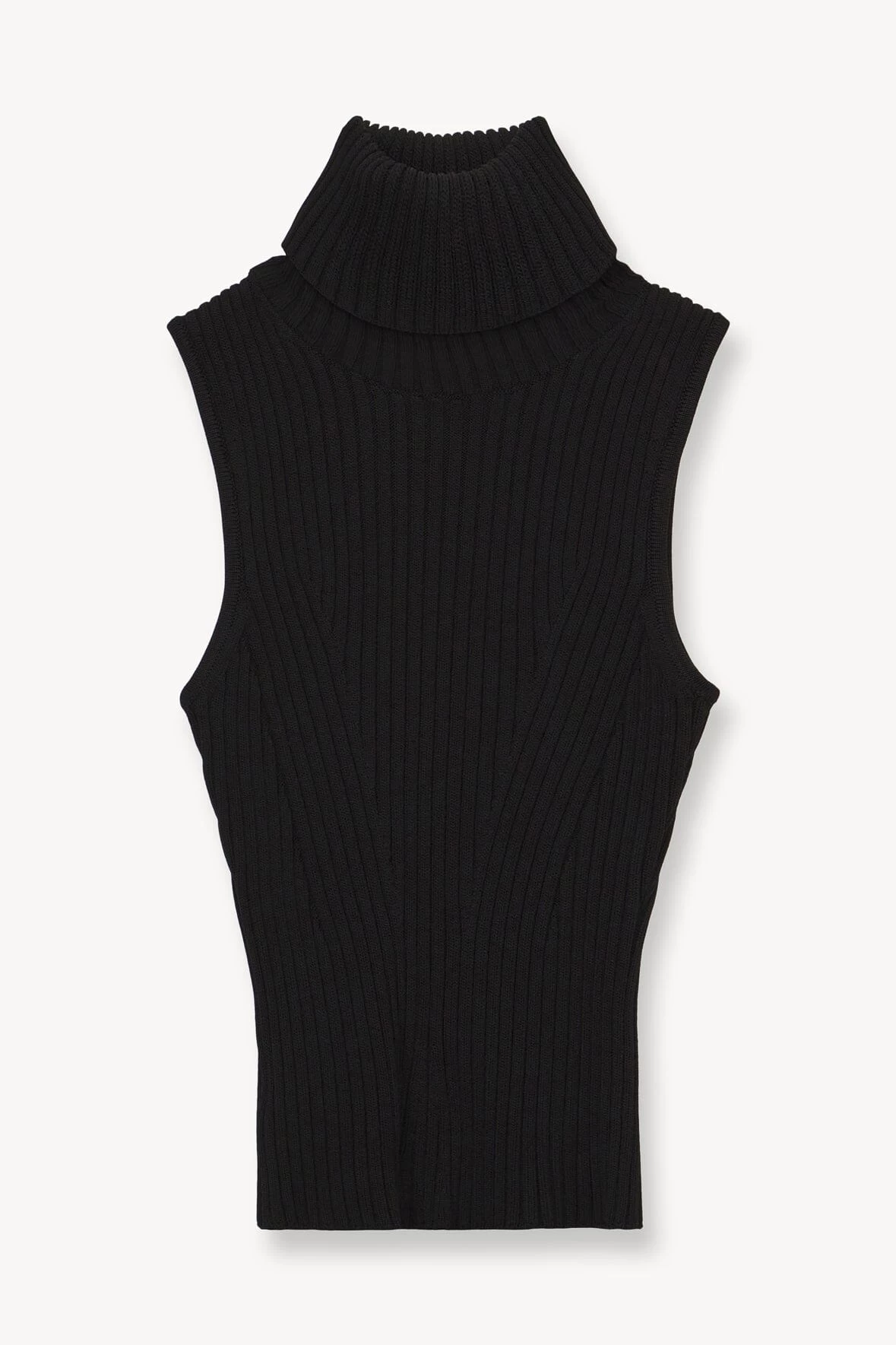 A sleeveless turtleneck top made out of a stretchy rib knit fabric. This style offers a fitted silhouette and full fashioning pattern throughout.
