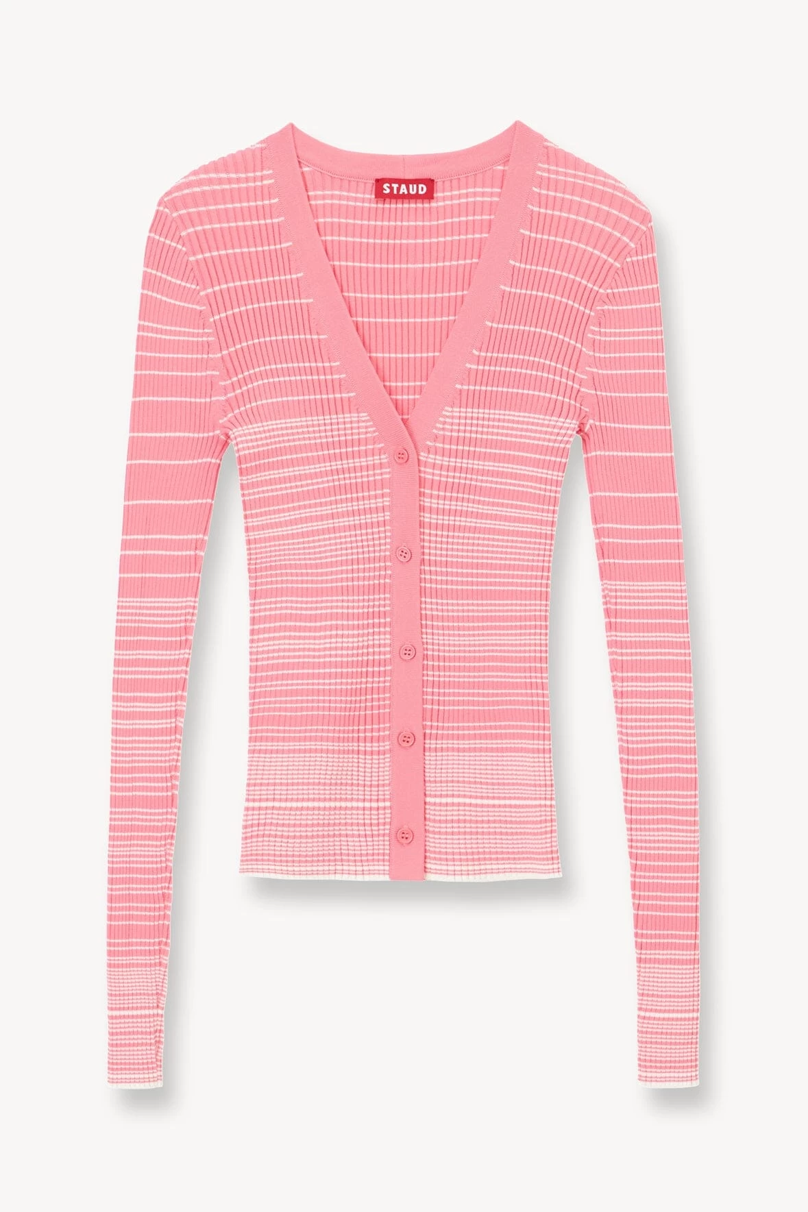 Our best-selling cardigan in a new ombre stripe pattern. The Cargo Sweater can be easily layered or worn as a top on its own. This style is constructed out of a stretchy rib knit fabric.