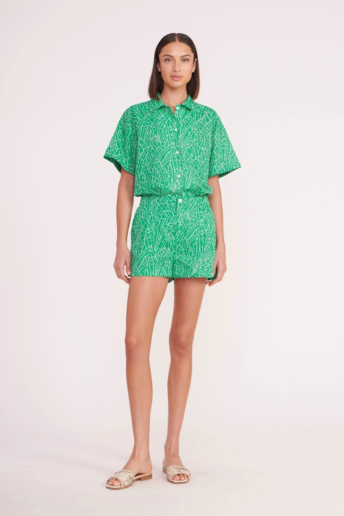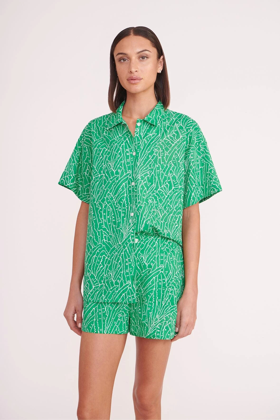 A boxy, short sleeve shirt with palm outlne print. The Channing top features a left patch pocket and completes a coordinating look when paired with the matching Zoey Short.