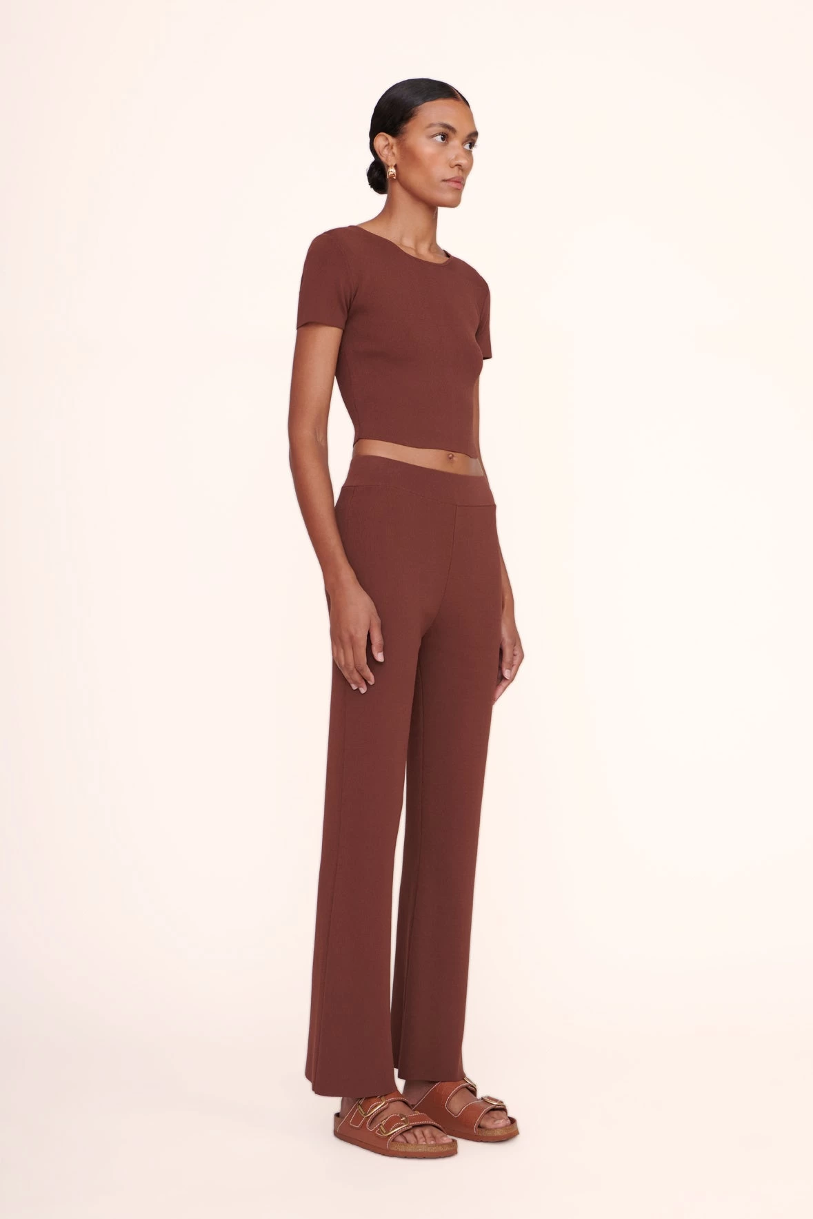The Estella is a high waisted flare pant constructed out of a compact rib knit fabric. This style completes a matching set when paired with the Lexi or Ila Tops.