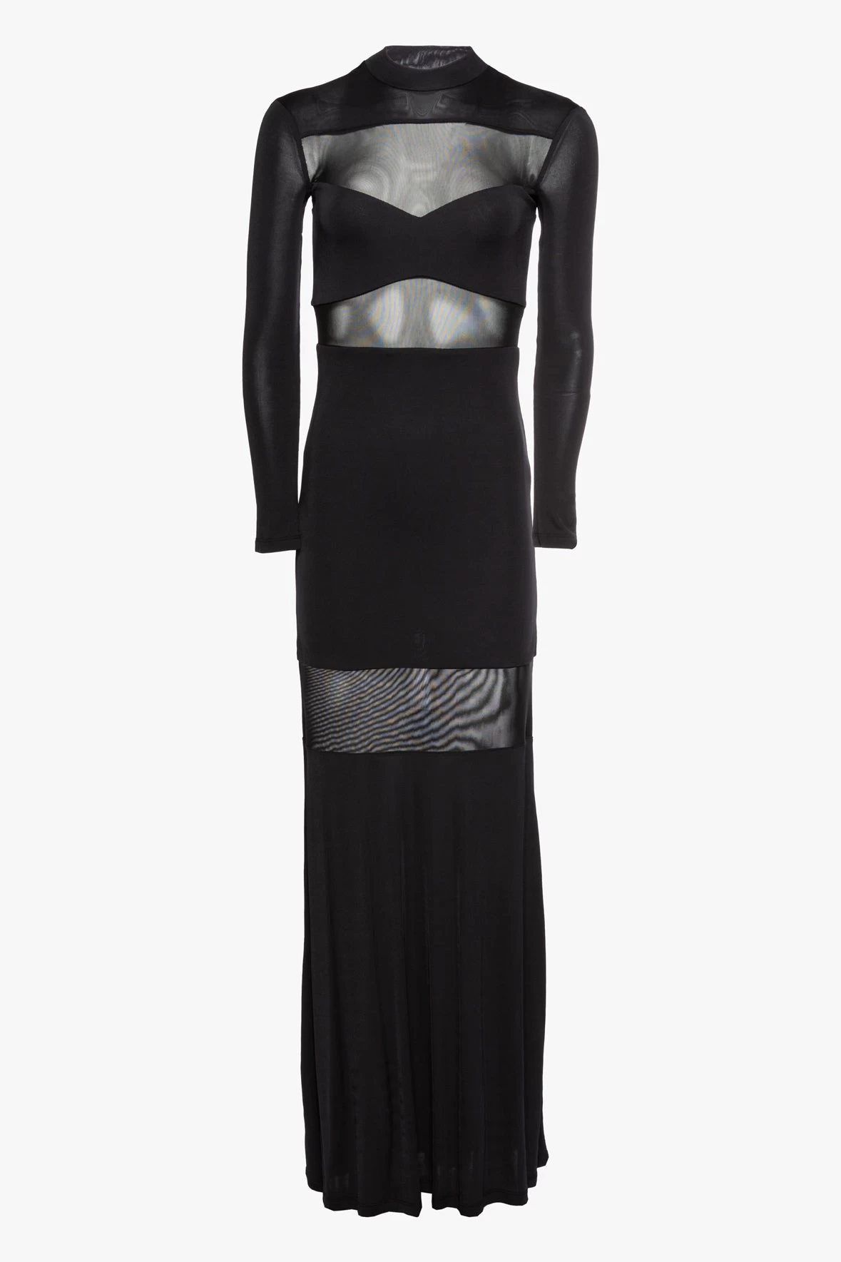 A stretch jersey gown with sheer mesh inserts, the Falcon Dress features a mock neck collar and long sleeves.