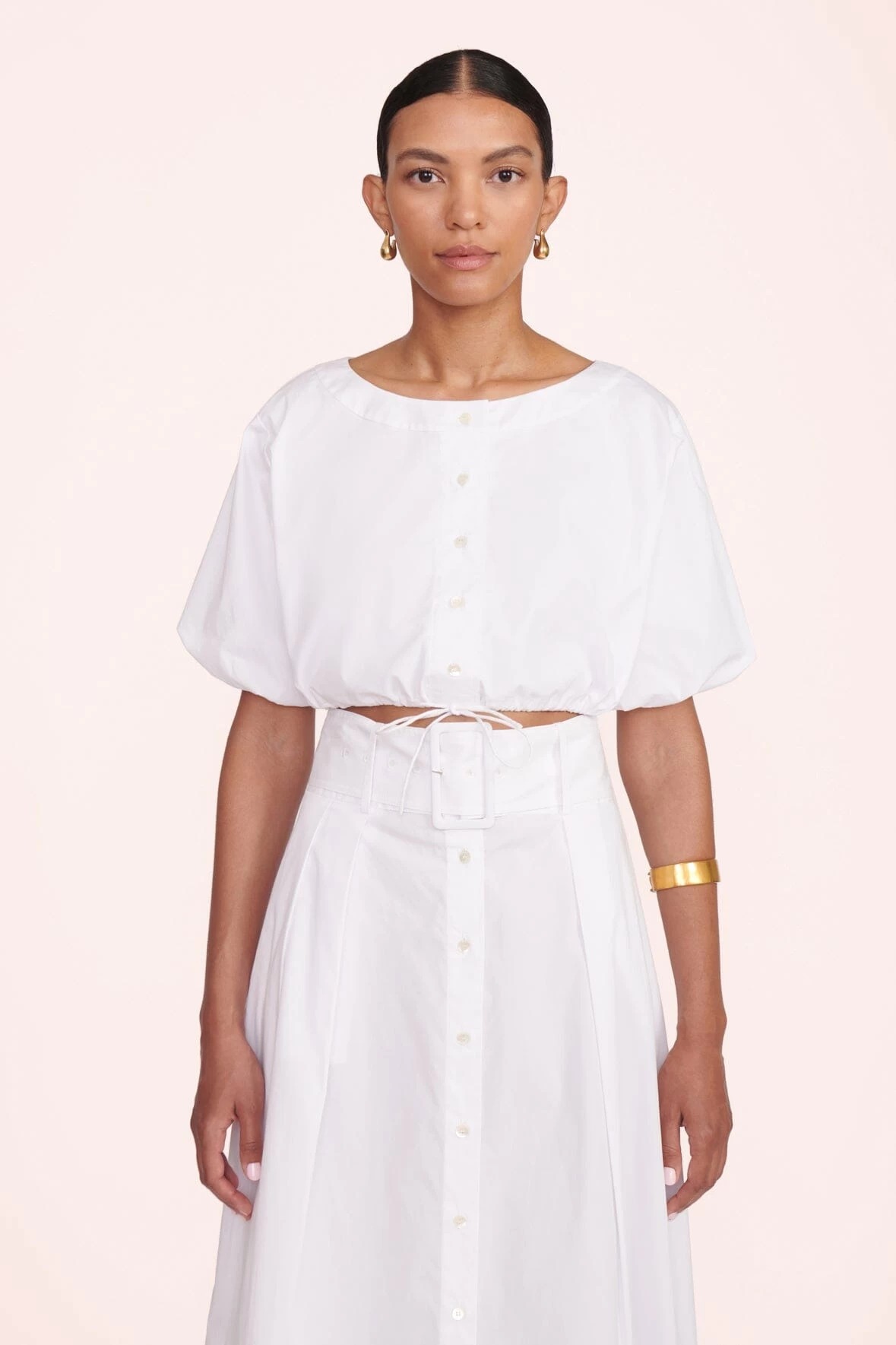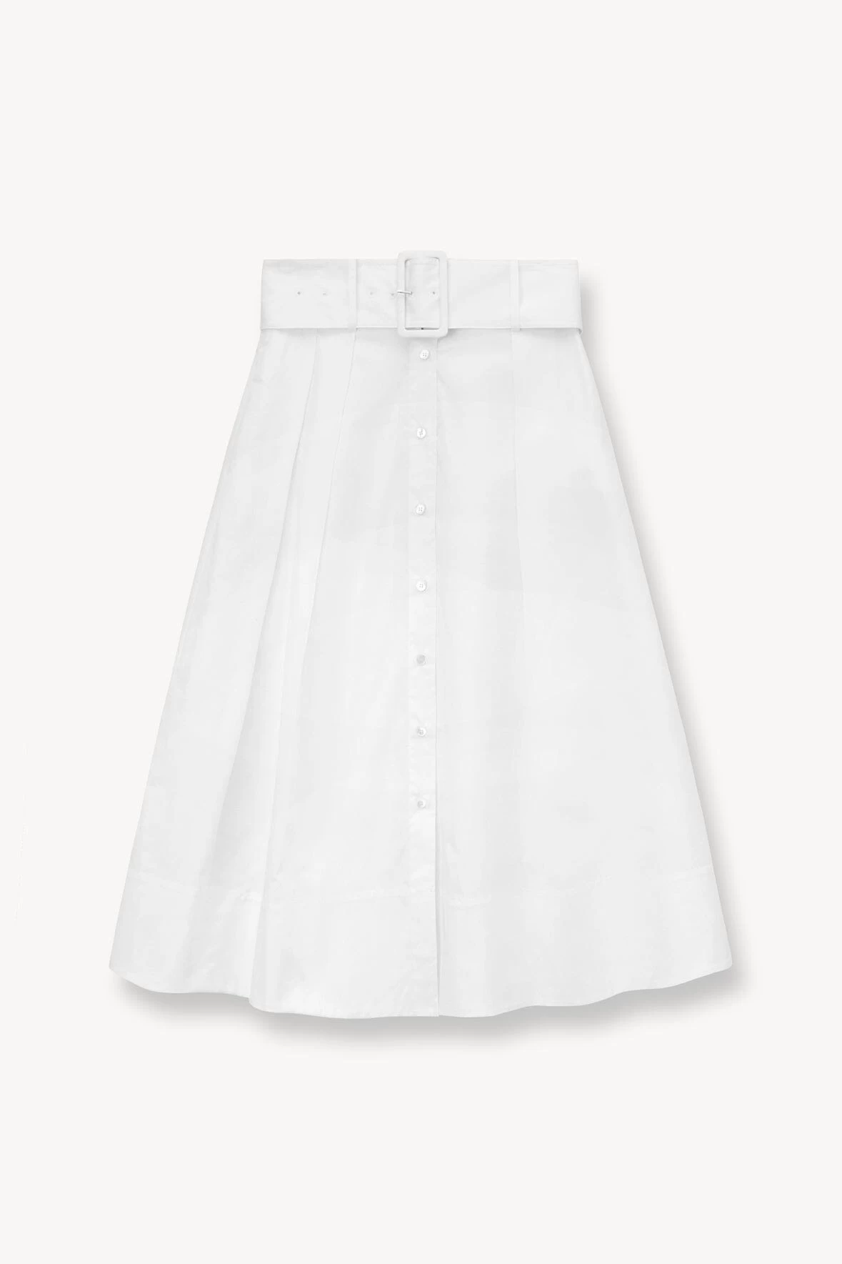 An a-line button down skirt with pleats and a wide belt. The Kingsley Skirt is made out of a stretchy cotton poplin fabric and completes a matching set when paired with the Ellington Top.