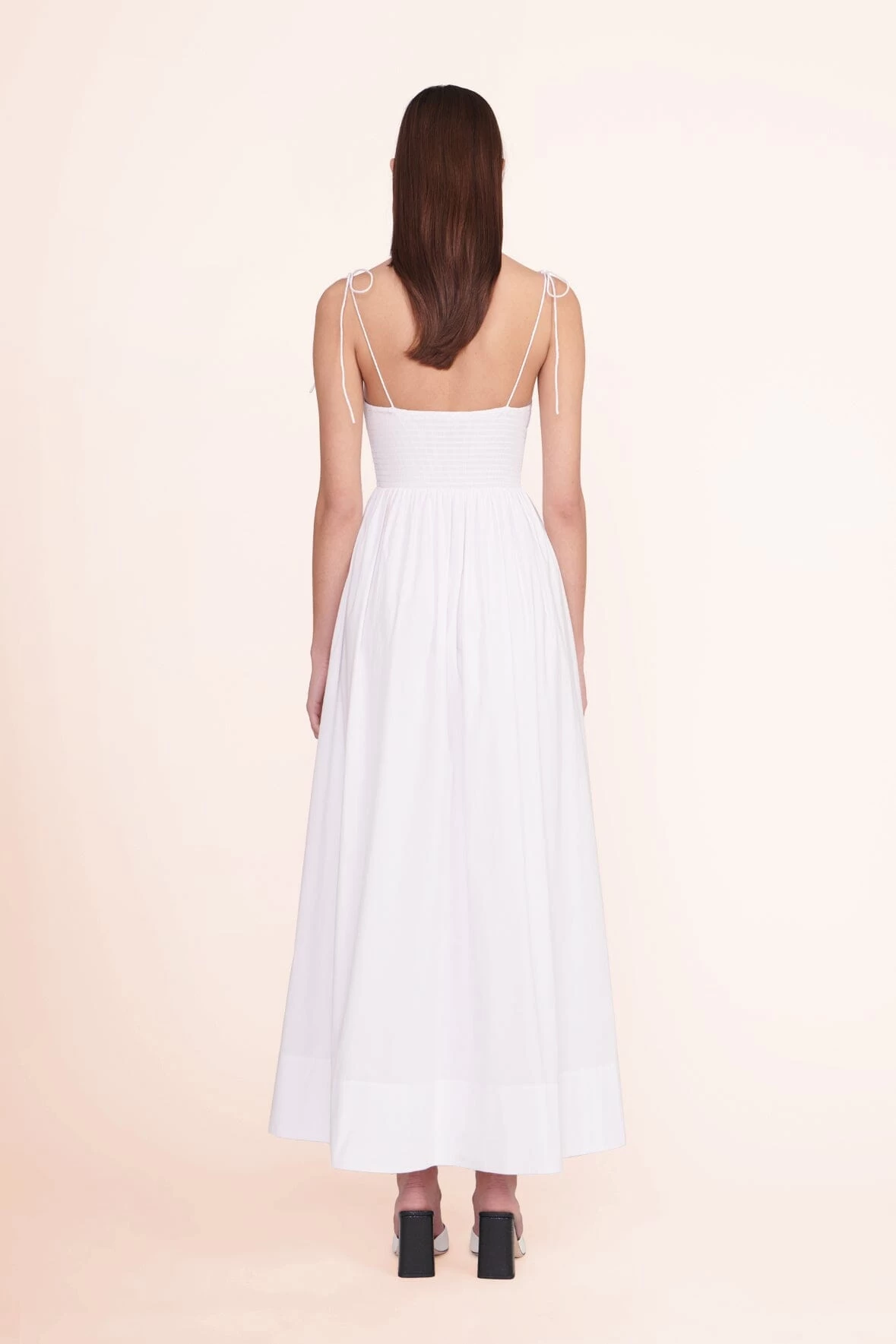 A cotton poplin maxi dress, the Landry Dress features a smocked corset bodice with adjustable tie straps. This style has a full skirt with shirring details and side seam pockets.