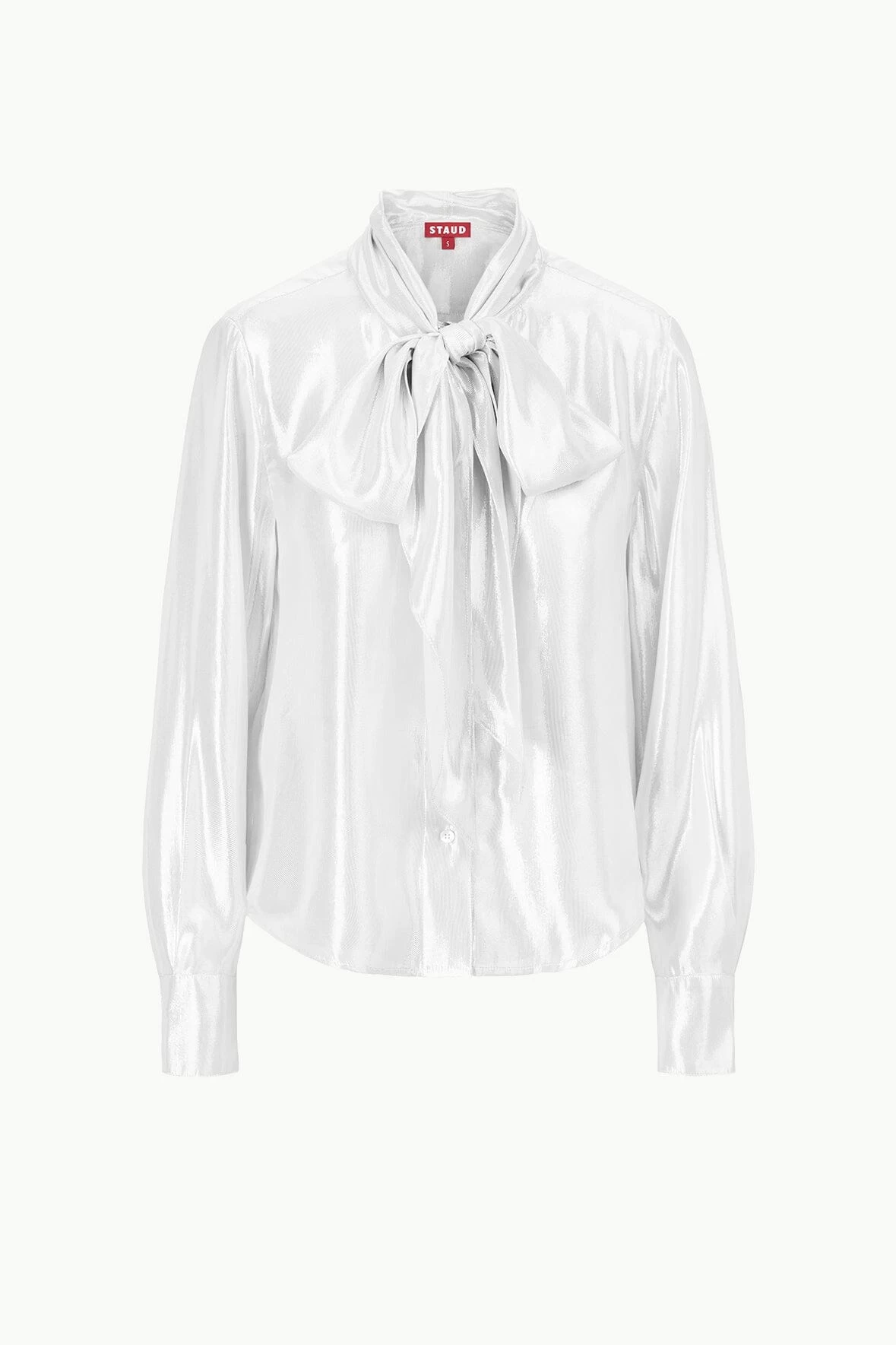 A classic button front blouse, updated with an oversized bow detail at the neck. The Maryn Top is cocktail-party ready in this silver lamé finish.