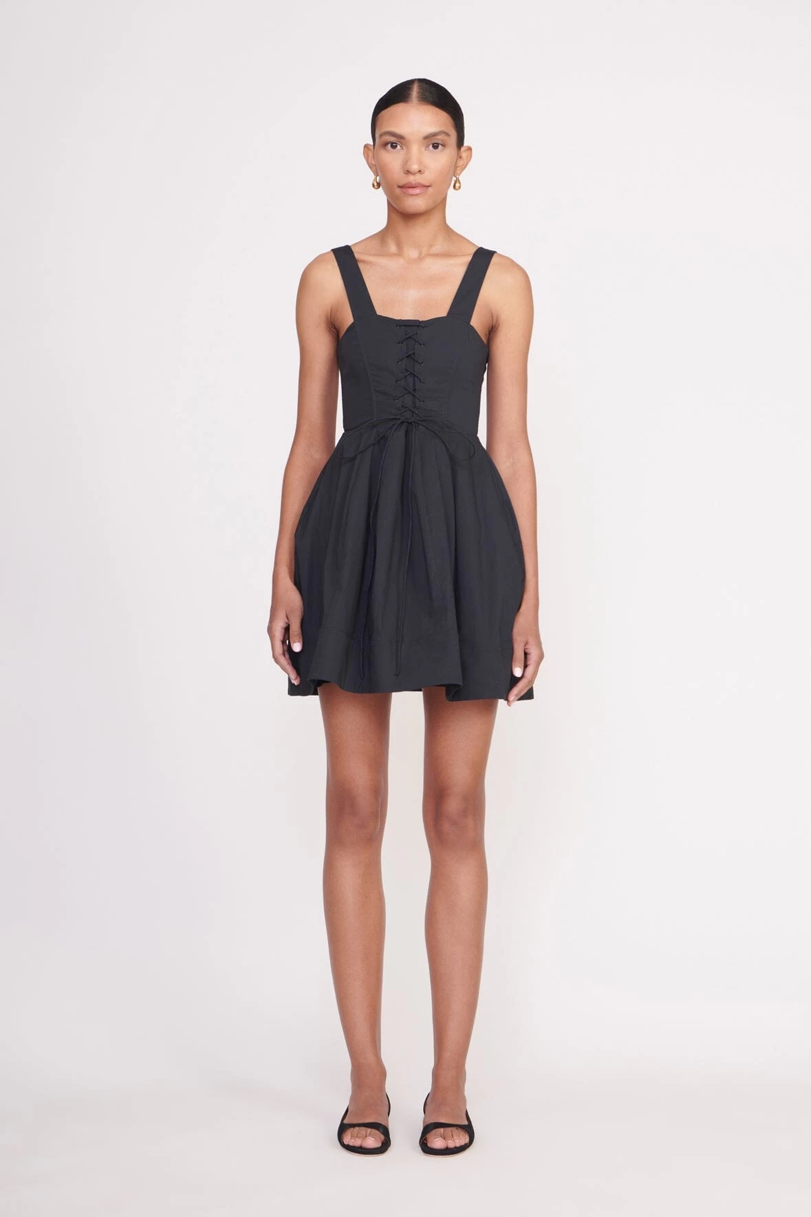 New for the season in stretch poplin, the Mini Sutton is a babydoll style dress with lace up corset detail.
