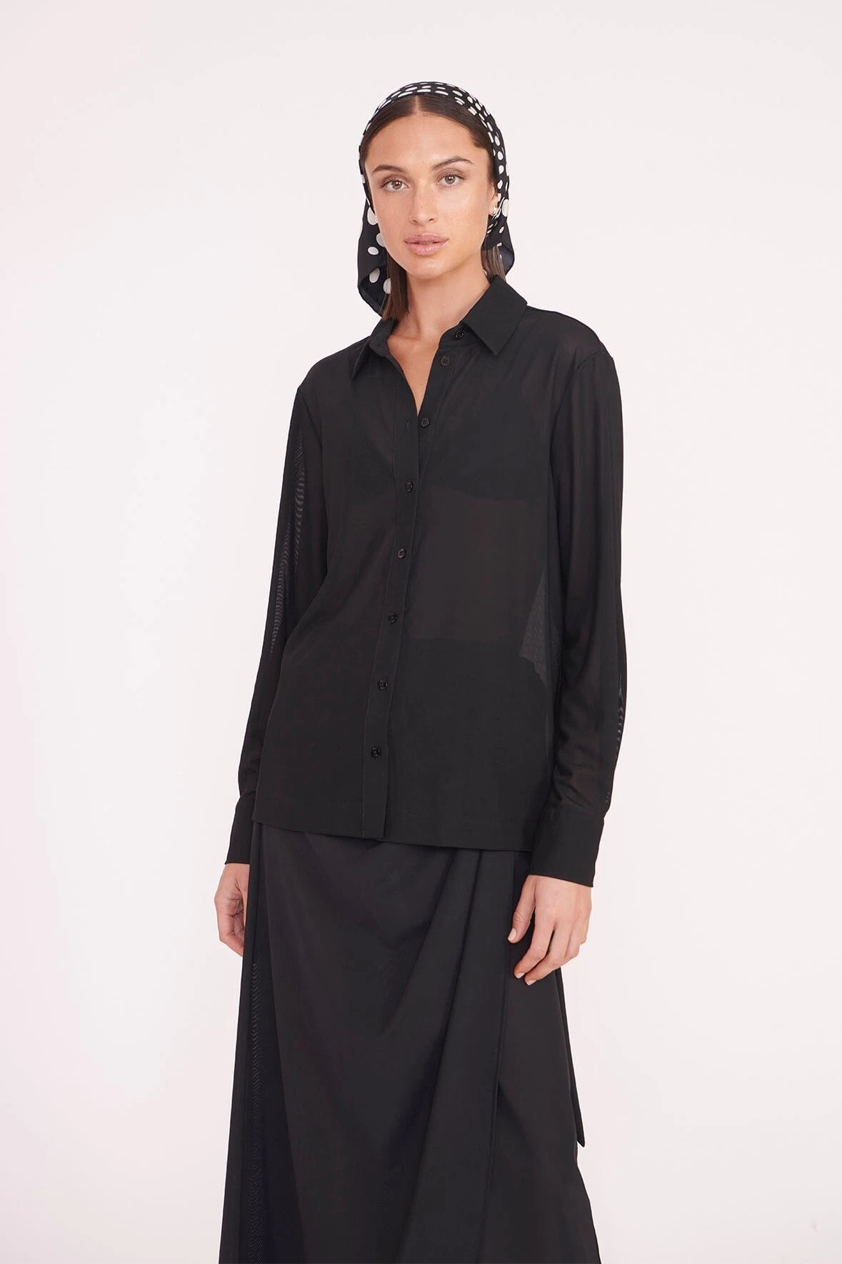 A versatile swimwear coverup fashioned after a classic button down shirt, The Miriam Top is made out of a power mesh fabric.