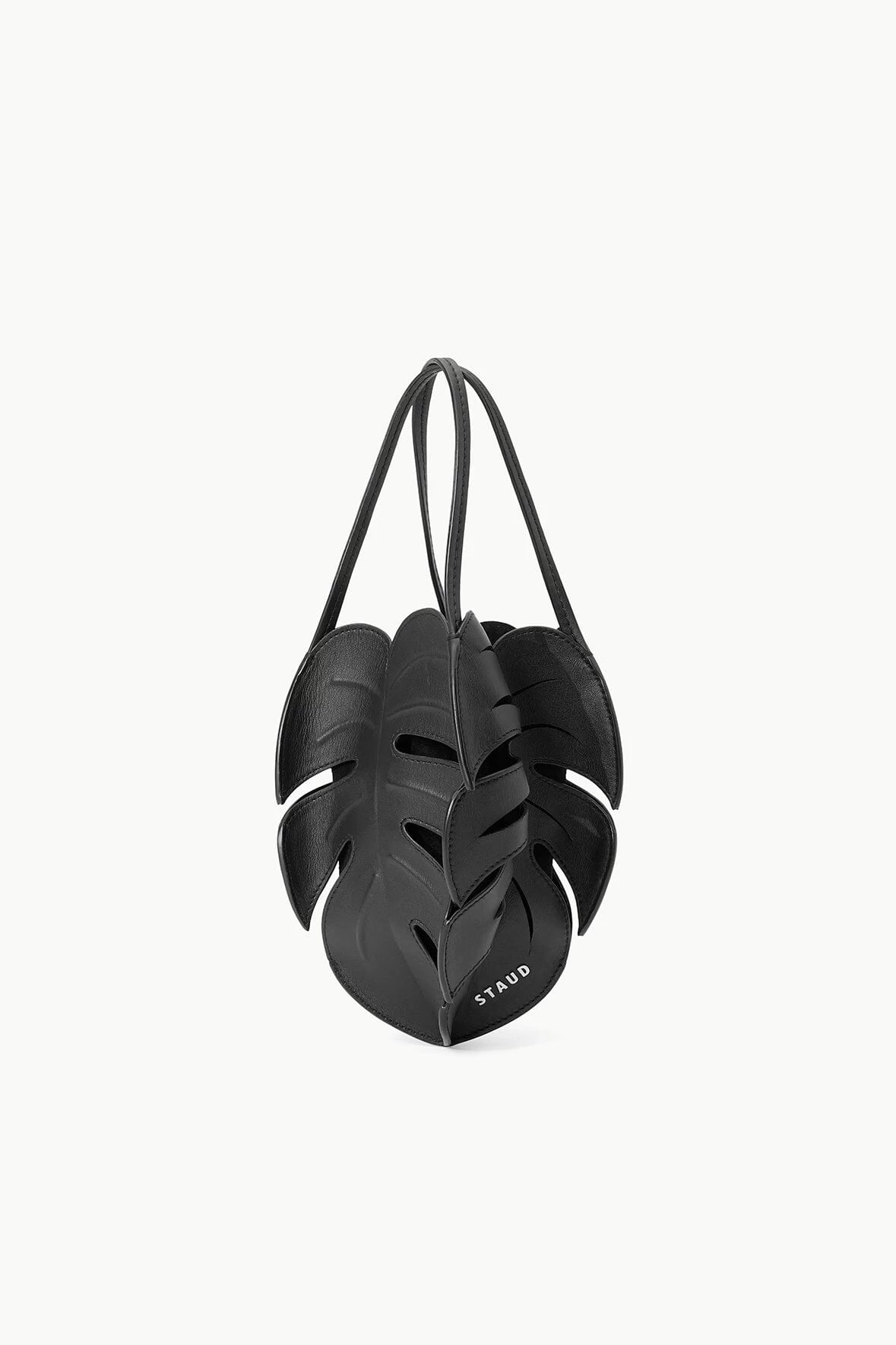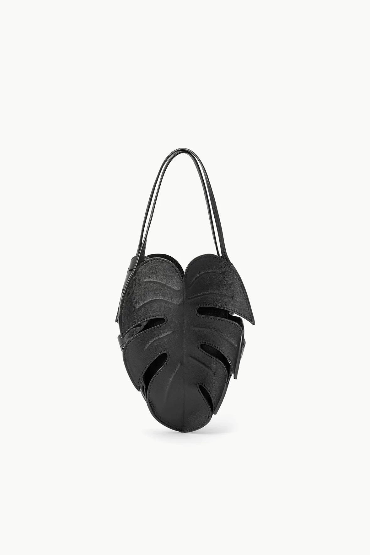 A handheld leather bag constructed of four leaf-shaped panels. The Palm Bag features two handheld straps and a magnetic closure.