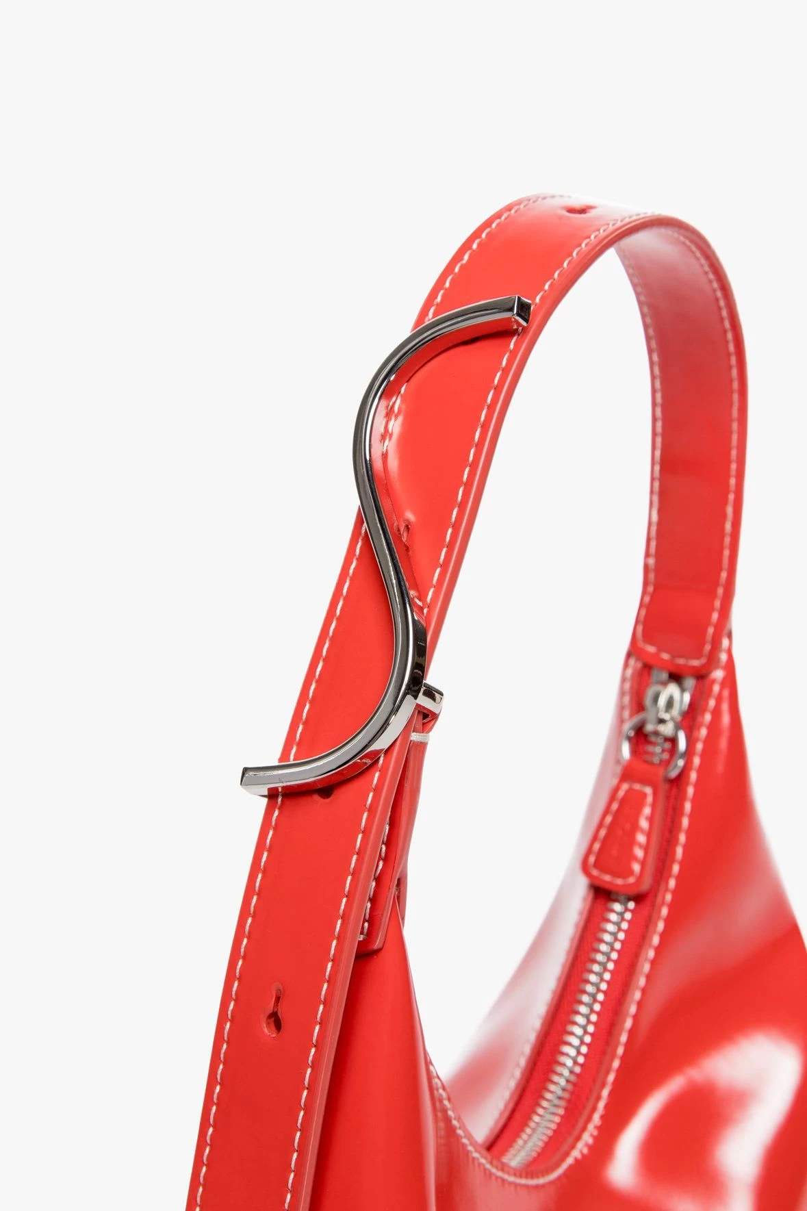 The Scotty Bag is a triangular shaped leather bag featuring adjustable top handle, zipper closure, S logo, and silver hardware. Made out of polished leather.
