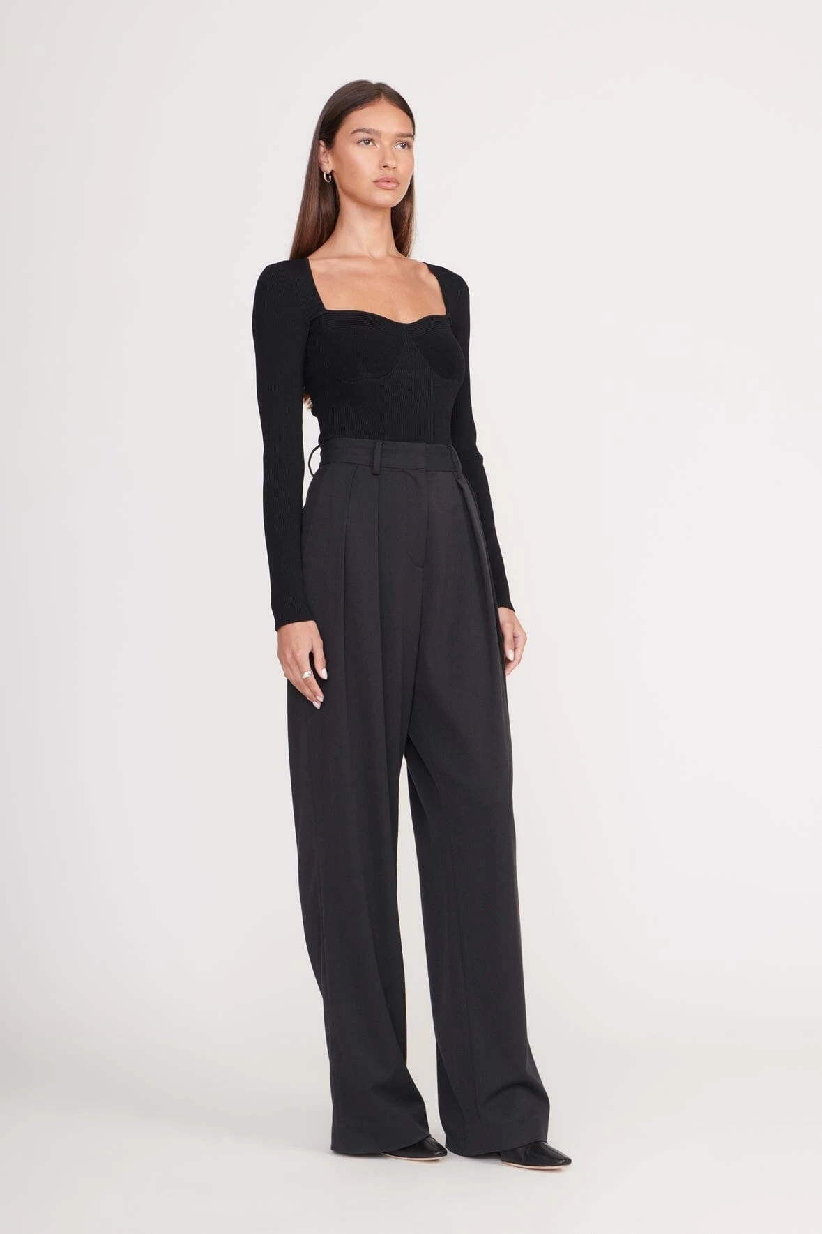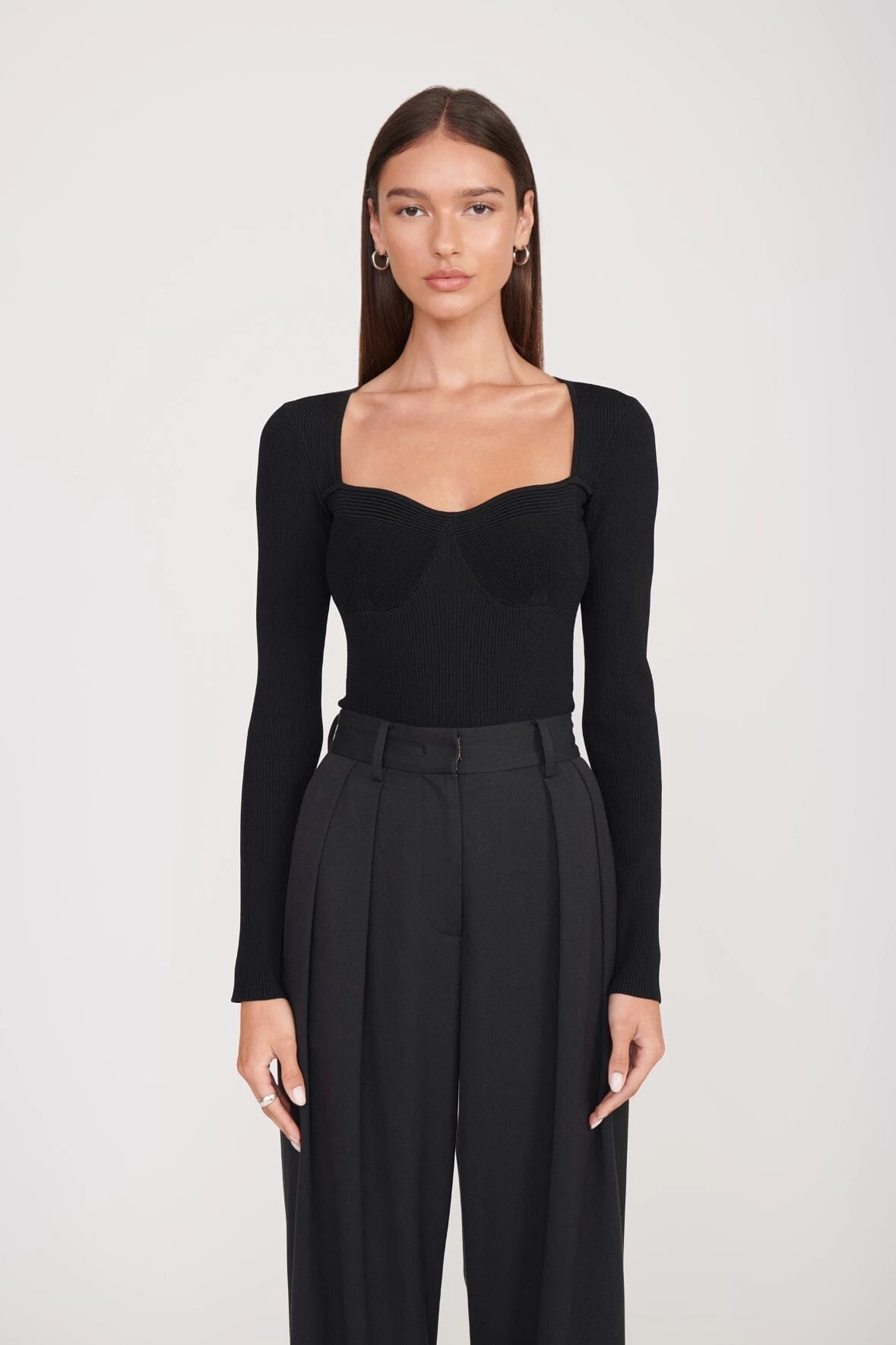 A long sleeve top made out of a fitted rib knit fabric. The Silhouette Top features an open sweetheart neckline and fully fashioned details at the cups.