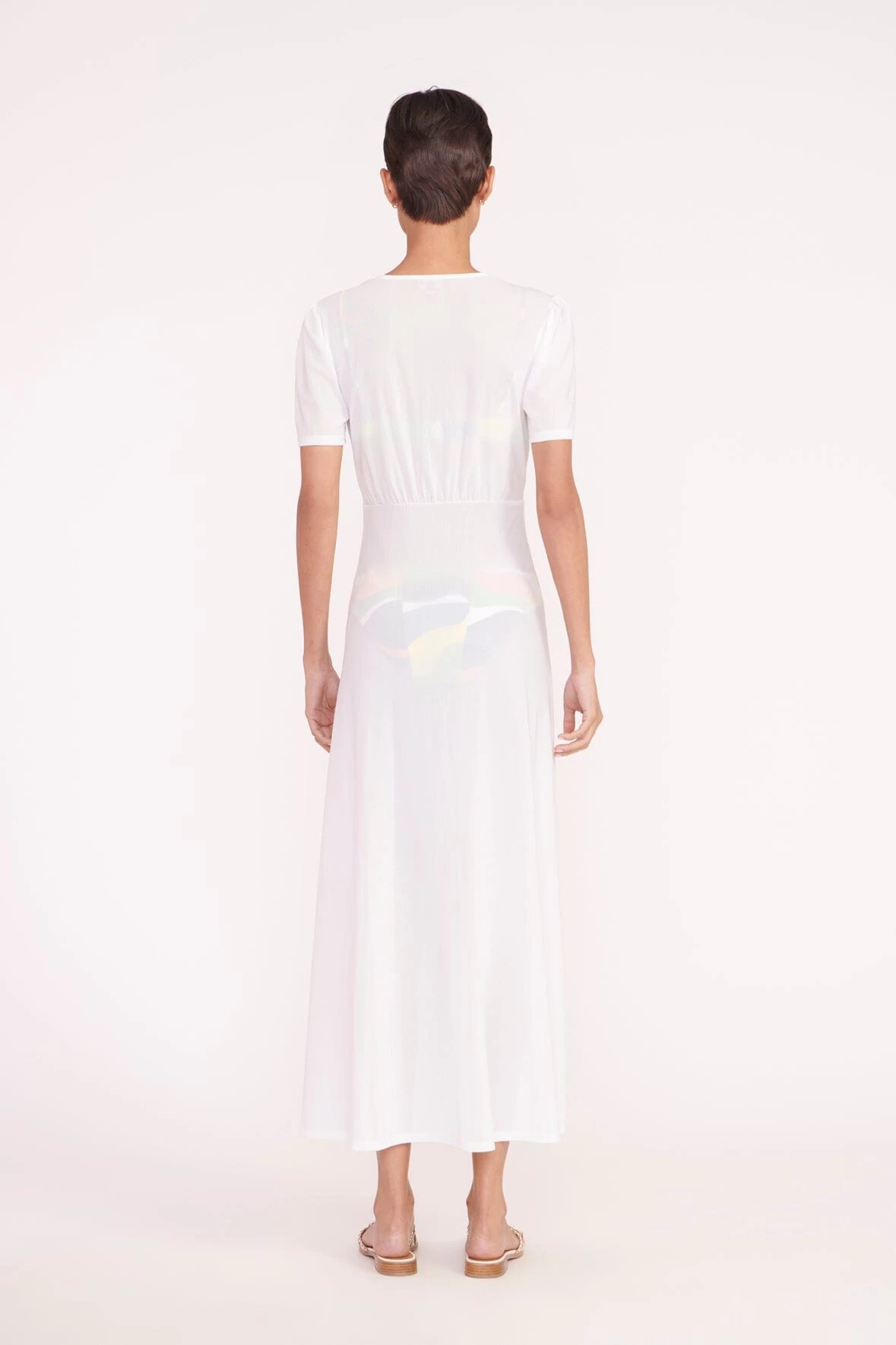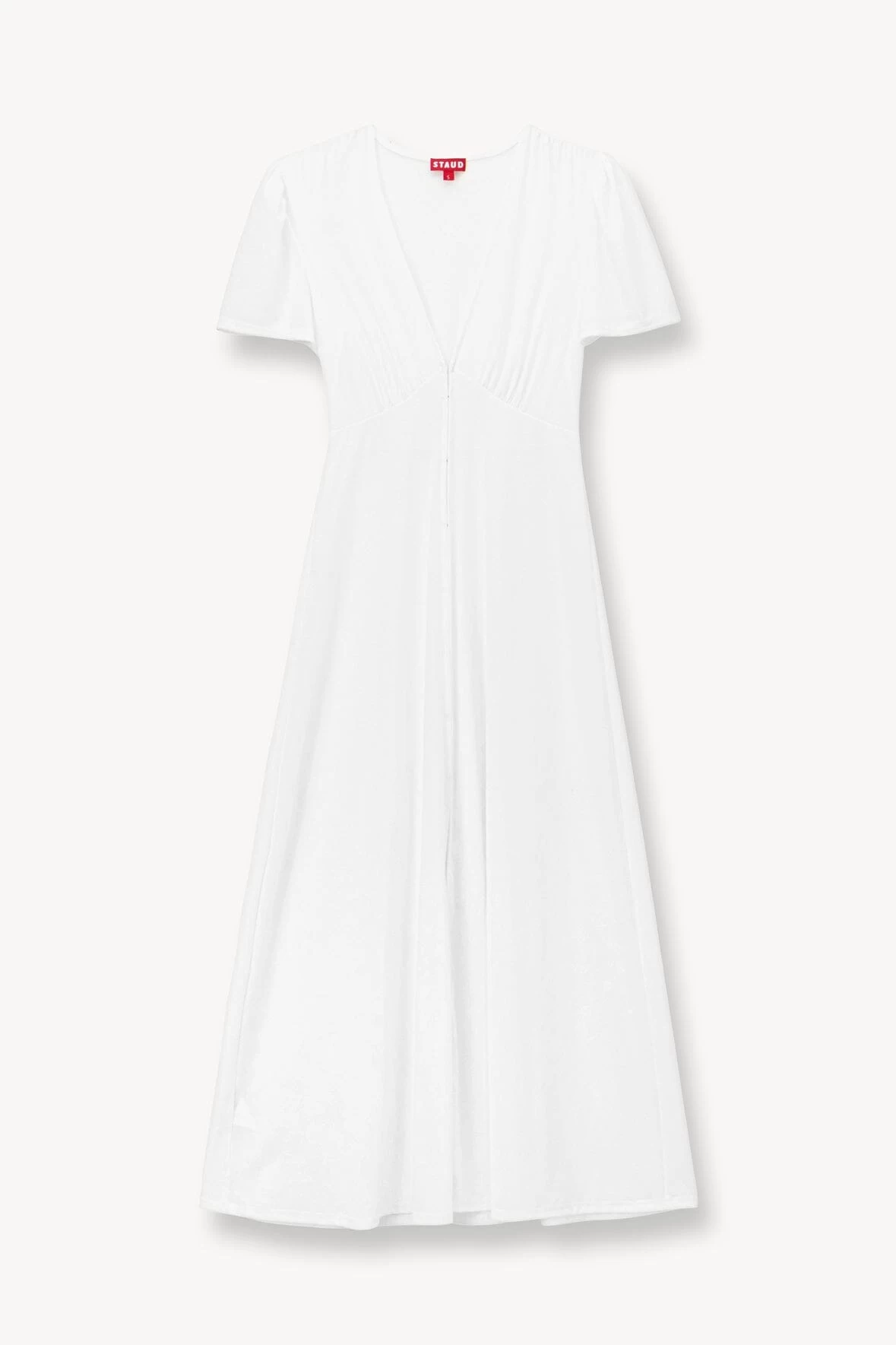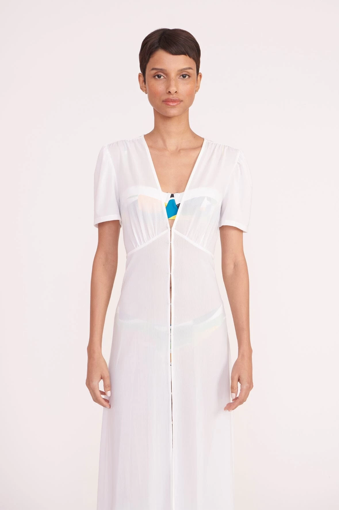 A coverup meant to take you to the beach and beyond, the Sonya is a sheer mesh coverup dress with short puff sleeves, a deep neckline, and a hook closures. This coverup can be styled opened or closed.