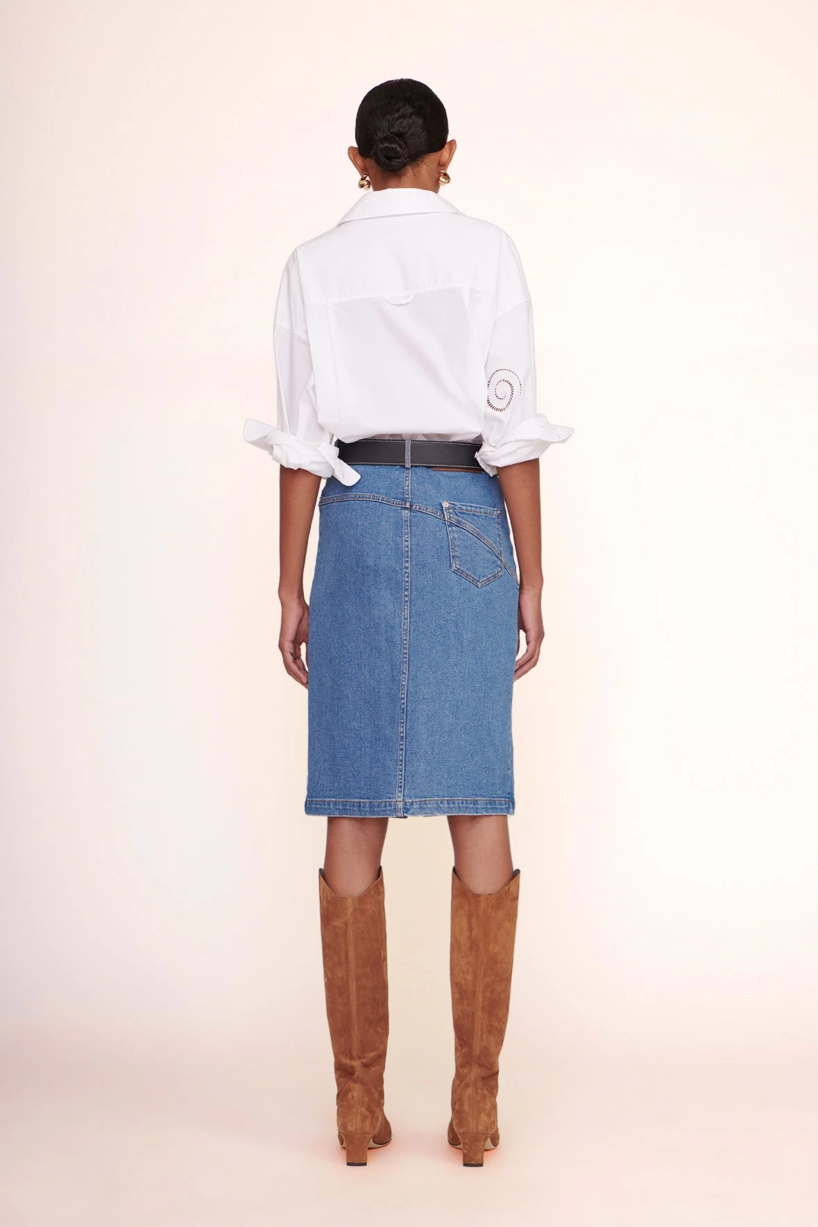 A 45mm leather belt with contrast top stitch. This style features a hammered prong buckle with swirl motif that matches our ready to wear collection.
