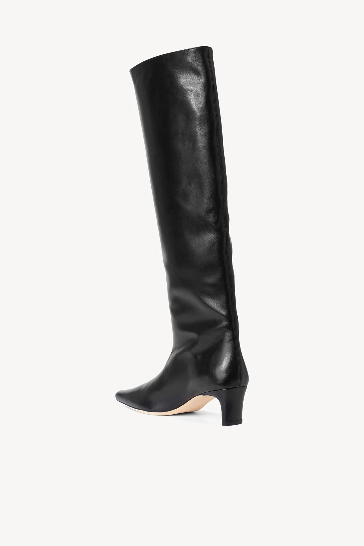 The Wally is a scrunched leather knee-high boot featuring a pointed toe and a slim heel design.